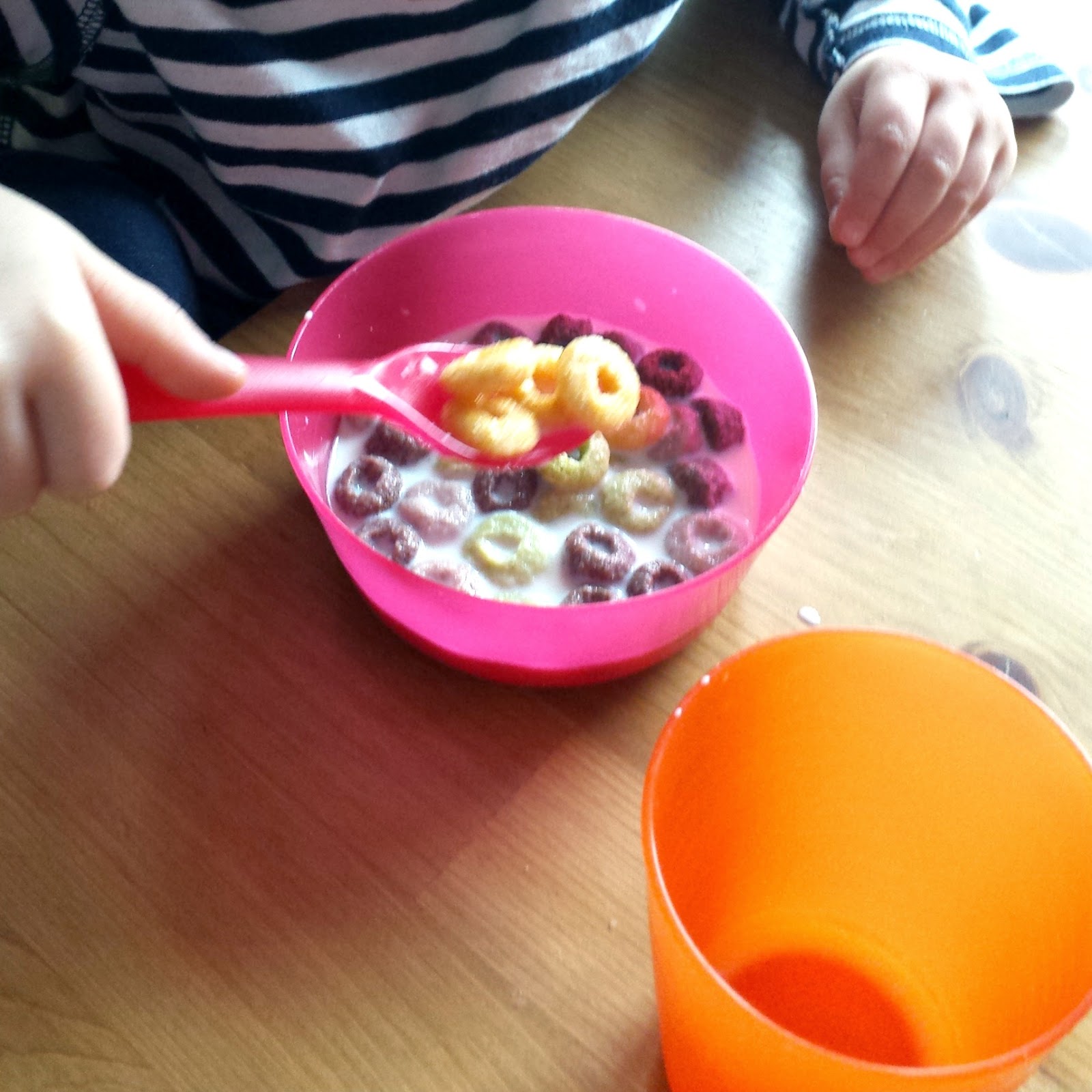 Am Donnderstag startete der Tag mit leckeren „Ringen“ zum Frühstück. Wirbelwind hat derzeit die Angewohnheit, gleiche Farben mit Begeisterung anzupreisen. Wenn Teller und Besteck beispielsweise die gleiche Farbe haben, ruft sie voller Freude: „Guck mal, passt zusammen!“. Auch die Ringe hat sie heute sortiert und sich alle mit der Farbe Orange auf den Löffel geladen.