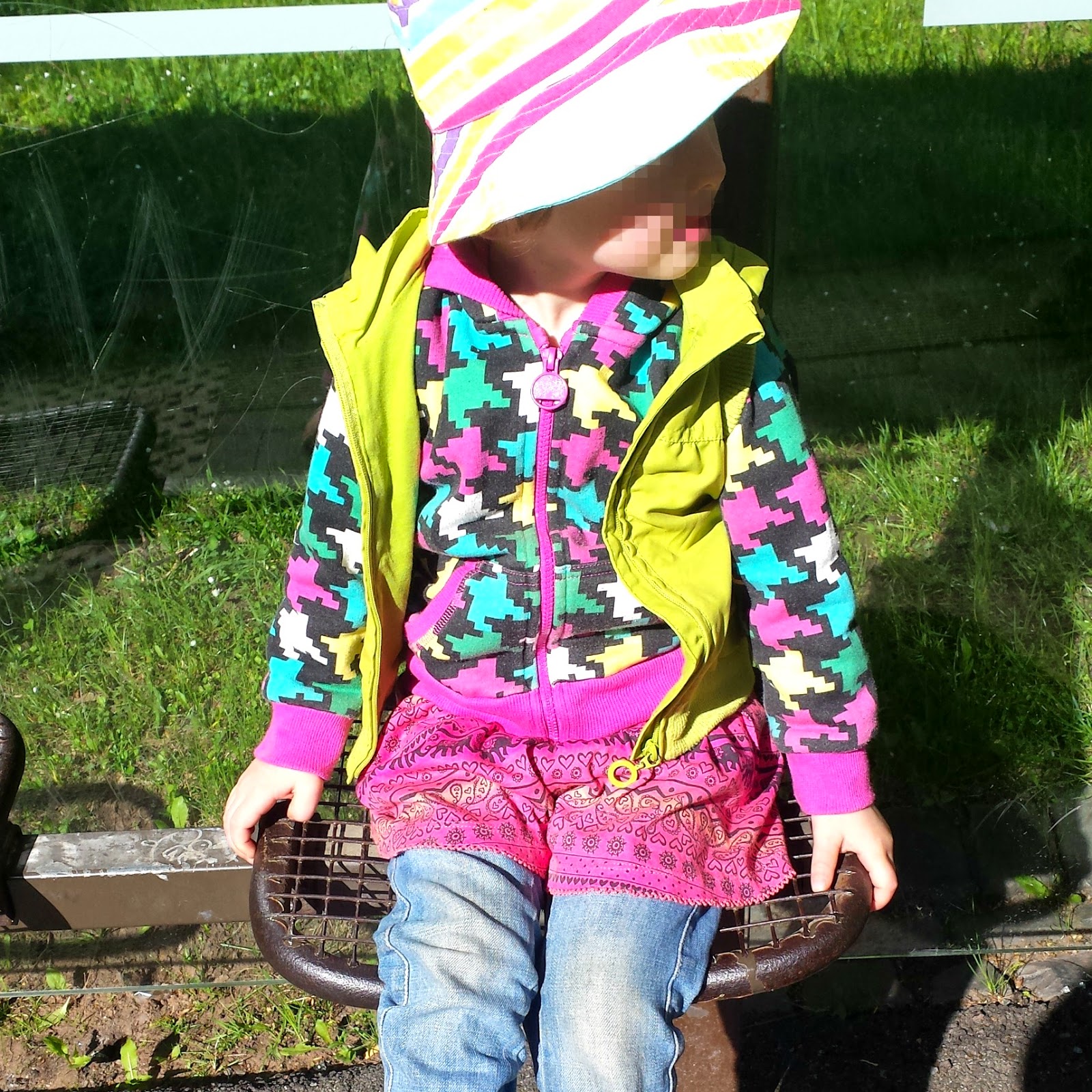 Das Outfit hat übrigens der Papa zusammengesucht, genauso wie auch am nächsten Tag. Wirbelwind steht derzeit auf Röcke und Kleider (das war vor einem Jahr noch undenkbar). Also eines muss man dem Papa lassen: kreativ ist er in der Kleiderwahl 😉