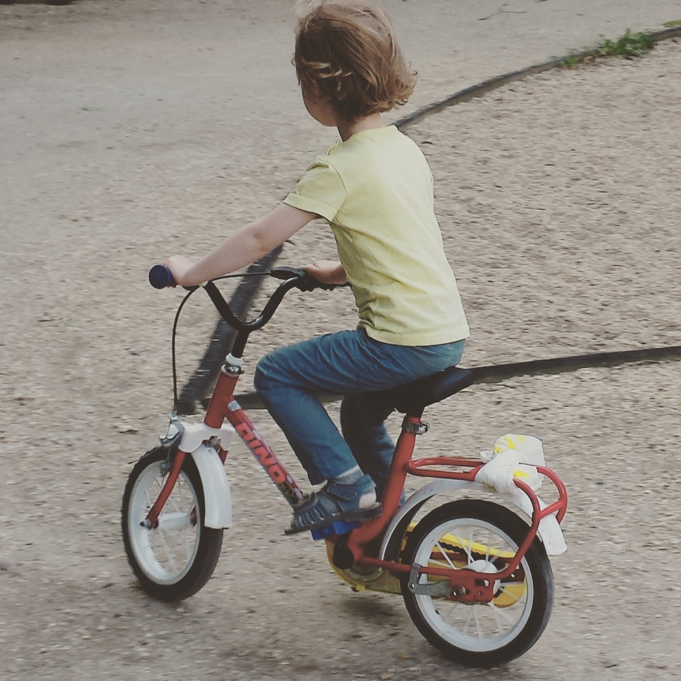 Und frisch gestärkt überraschte uns unser Wirbelwind doch tatsächlich: Sie fuhr plötzlich ohen Hilfe Fahrrad. Das hatte sie (gebraucht) zum dritten Geburtstag geschenkt bekommen, aber bislang wenig beachtet. Und heute dann fuhr sie auf einmal alleine los. Verrückt. Ich hatte gleich mal Gänsehaut bekommen. Ganz ruhig, Mamaherz!