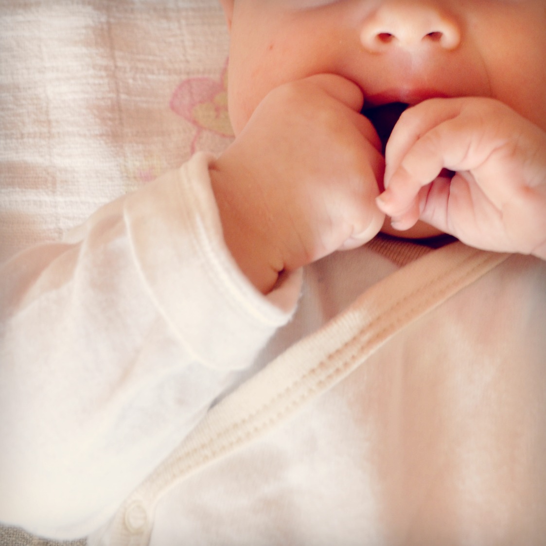 Beim Stillen spielt sie mit ihren Händen. Vor ein paar Wochen noch hielt sie die Hände vor die Brust, als hätte sie unsichtbare Hosenträger an. Inzwischen sind die Hände mehr in die Mitte gewandert und haben sich nun getroffen und vereint. Es war Liebe auf die erste Berührung 😉