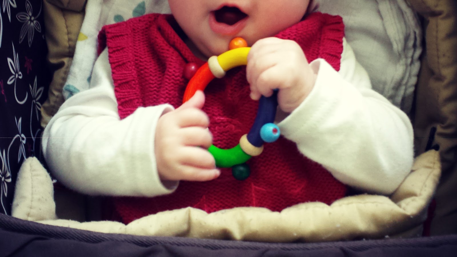 die Rassel vor das Gesicht, nimmt die andere Hand hinzu und steckt sich die