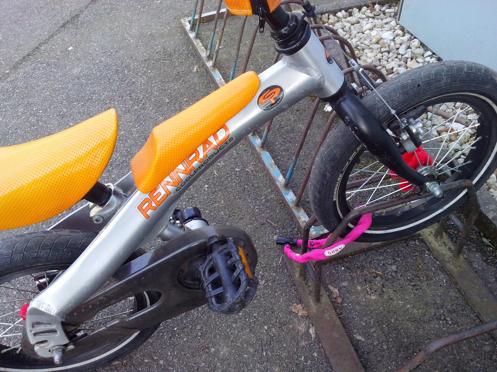 Szene 3: Wir erreichen den Kindergarten. Wirbelwind starrt auf ein grau-orange-farbendes Laufrad. „Hey, das Schloss ist ja pink. Das passt doch gar nicht.“ Ich frage nach: „Warum passt das nicht?“ „Na weil das ein Jungs-Laufrad ist.“ „Welche Farbe müsste das Schloss denn dann haben?“ „Na schwarz. Oder grün.“