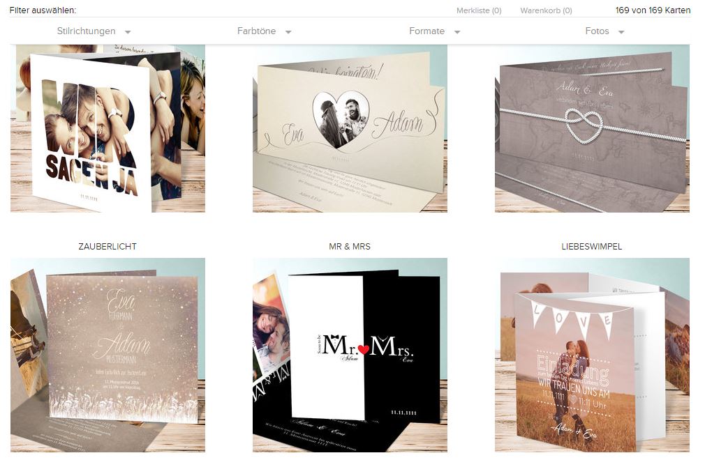 Was überzeugt sind die zahlreichen Designvorlagen. Allein für die Hochzeitskarten gibt es 169 (!) Designs, aus denen der Nutzer wählen kann. Wahnsinn.
