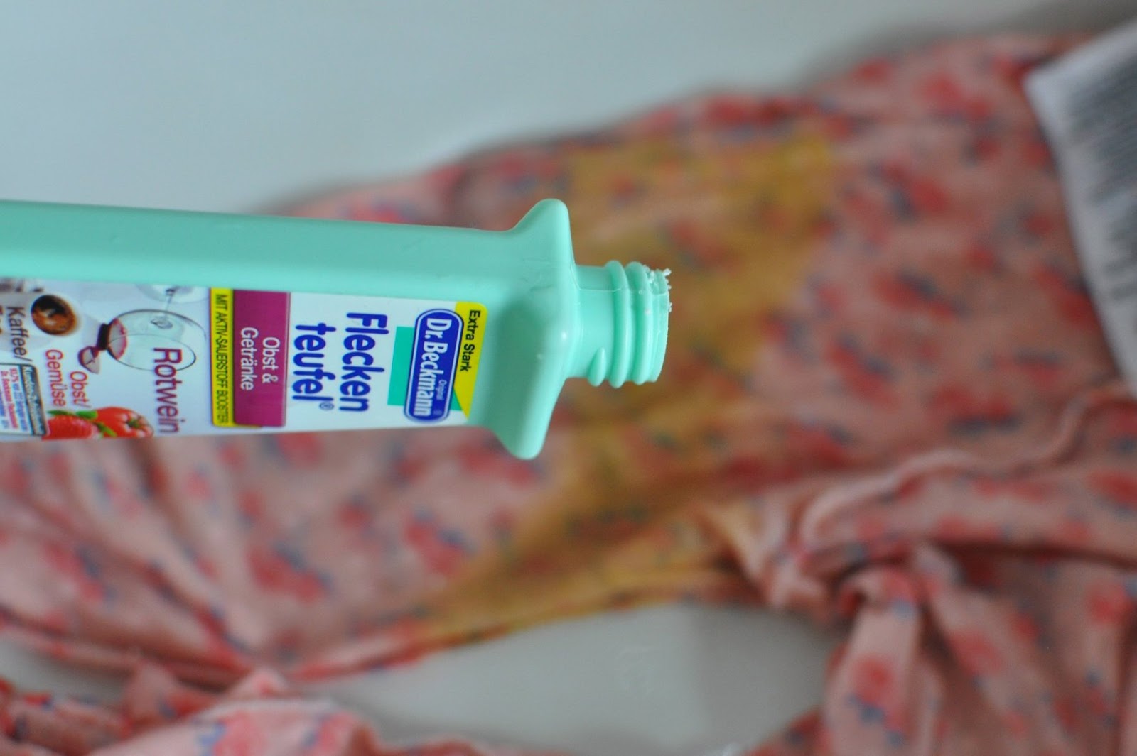 Um ehrlich zu sein weiß ich gar nicht so genau, wie wir darauf gekommen sind. Ich beauftragte den Mann einen Fleckenteufel zu kaufen, damit die geliebte Babykleidung irgendwie wieder vorzeigbar wird. Er brachte dann den Fleckenteufel „Obst & Getränke“ mit.