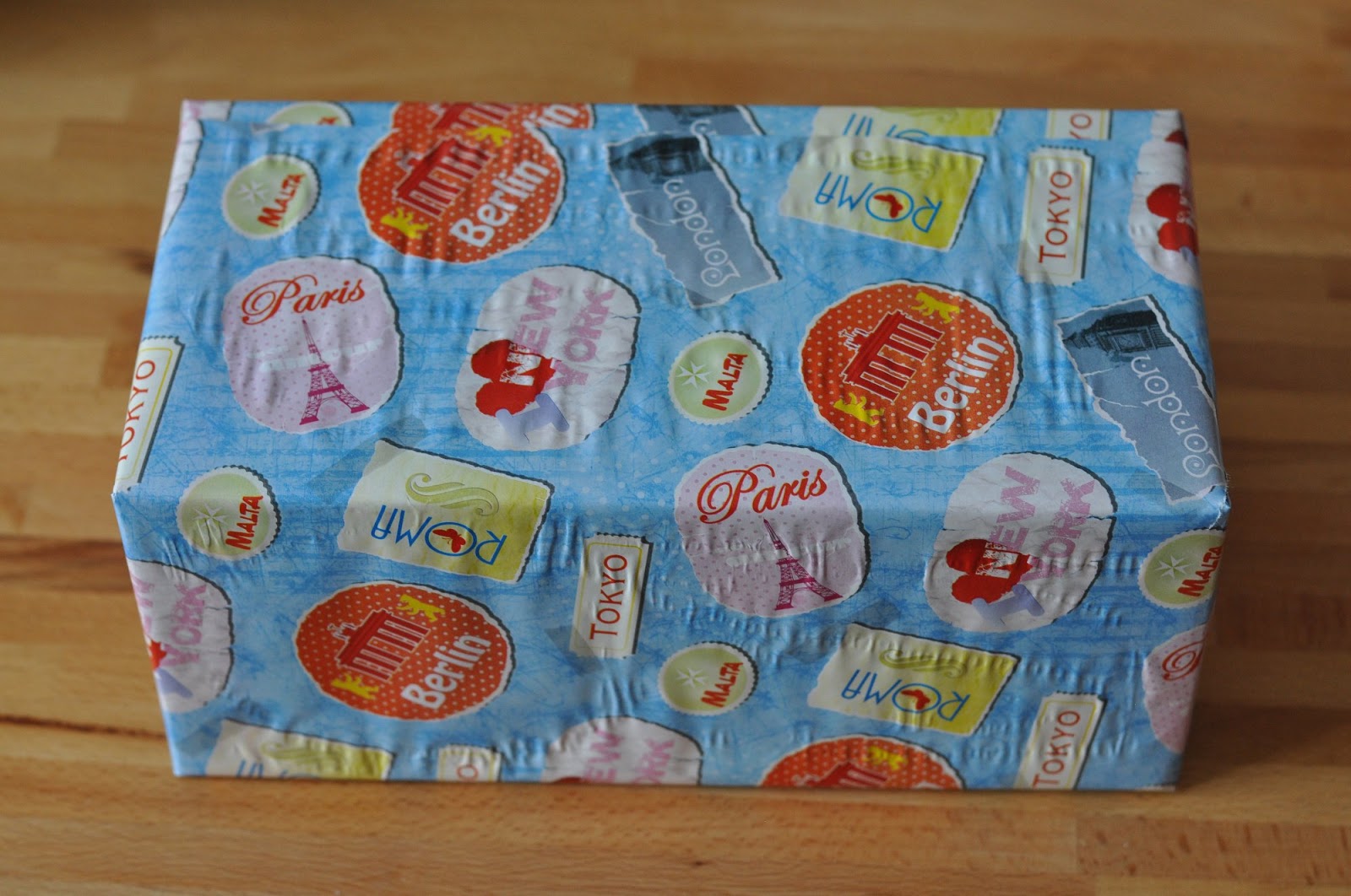 3. Um die Box ansehnlicher zu machen, könnt Ihr sie mit Geschenkpapier verschönern. Dem Baby ist es sicherlich egal, aber die Mama-Augen gucken ja auch mit. Also einmal den Karton mit Geschenkpapier einwickeln und festkleben.