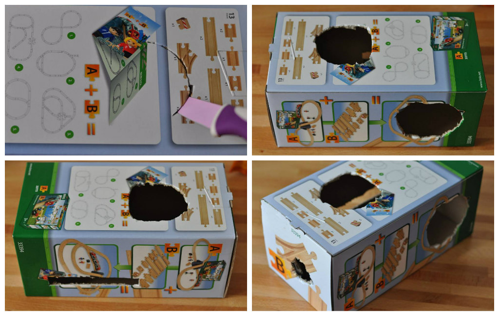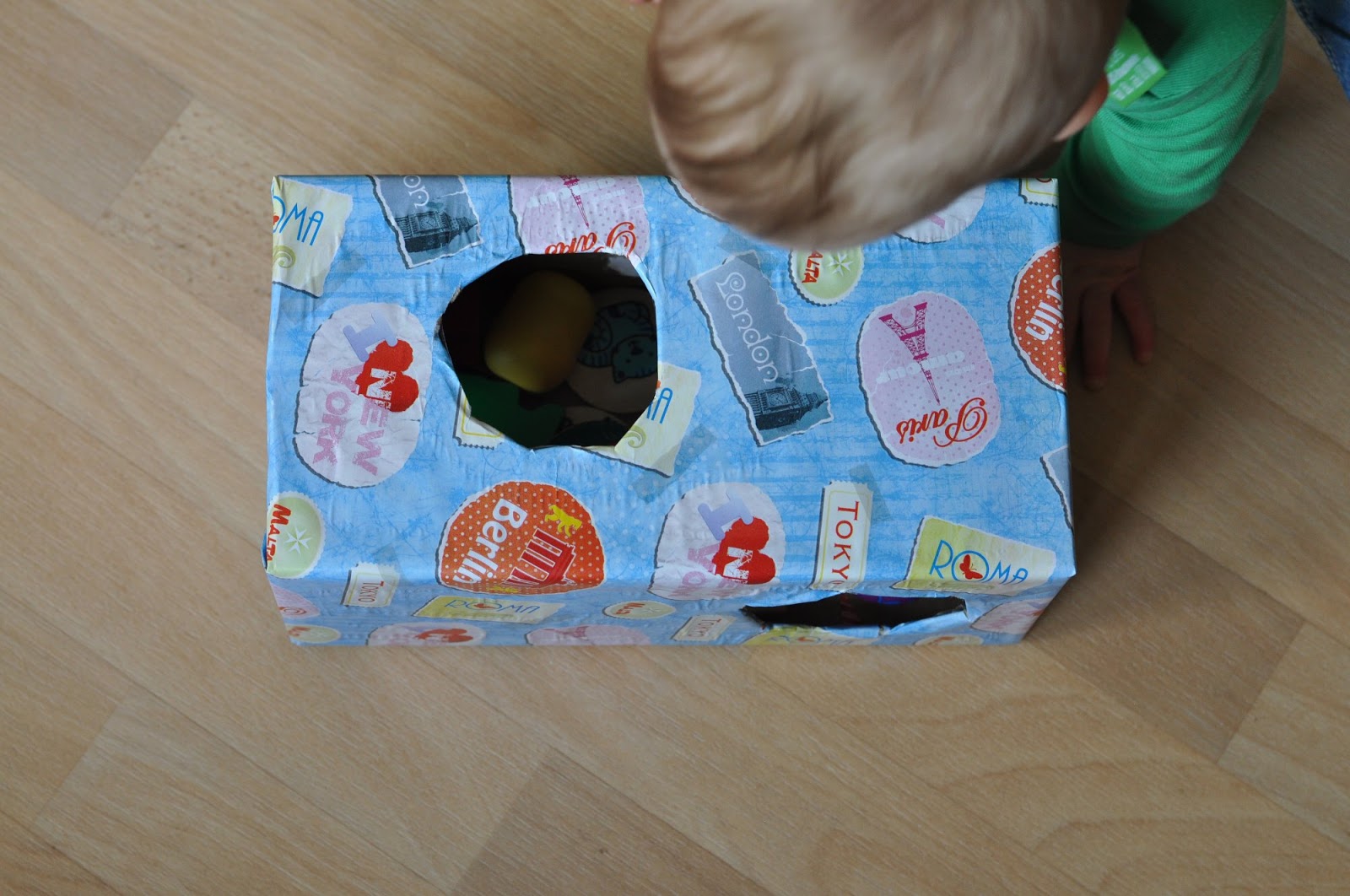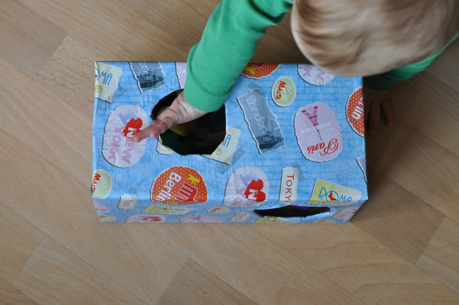 Die Box ist sehr schnell und einfach zu basteln. Die folgenden Schritte sollen es Euch verdeutlichen:1. Man nehme einen Karton. Er sollte mindestens Schuhkartongröße haben, damit die Löcher groß genug für die kleinen Babyhände ausgeschnitten werden können.