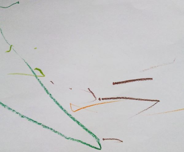Sie malt. Es sieht zwar noch sehr ungewöhnlich aus, wie sie den Stift hält, aber sie malt. Ganz bewusst bewegt sie den Stift über das Papier. Manchmal die richtige Seite, wie auf dem unteren Bild geschehen, und manchmal auch die Rückseite des Stiftes 😉