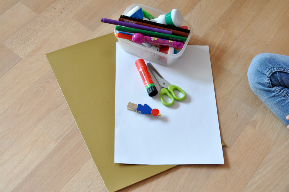 Nun haben wir das Problem, dass Wirbelwind mit seinen vier Jahren die Wochentage und somit das Ausmaß einer ganzen Woche nur schwer verstand. Aber ganz ins Blaue wollte ich dann doch nicht experimentieren. Daher war der erste Schritt, einen Wochenplan zu basteln, um ihr einen Überblick zu verschaffen (Inspiriert von der lieben Tanja von Tafjora).Im Grunde ist dieser Wochenplan schnell erledigt: Man nehme eine Pappe sowie ein helles Blatt Papier (gerne auch in einer bunten Farbe), dazu ein paar Filzstifte, Schere, Kleber und eine Klammer. Fertig.