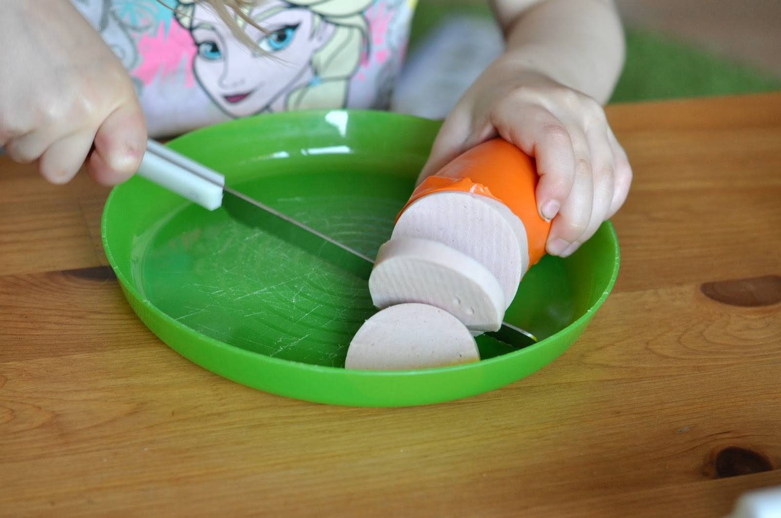 11. Am Nachmittag waren wir in der Stadt Eis essen und nochmal auf dem Spielplatz. Die Kamera hatte Mama nicht mit. Aber zum Abendbrot hat sie uns wieder geknipst. Wirbelwind schneidet sich so begeistert die Wurst herunter.