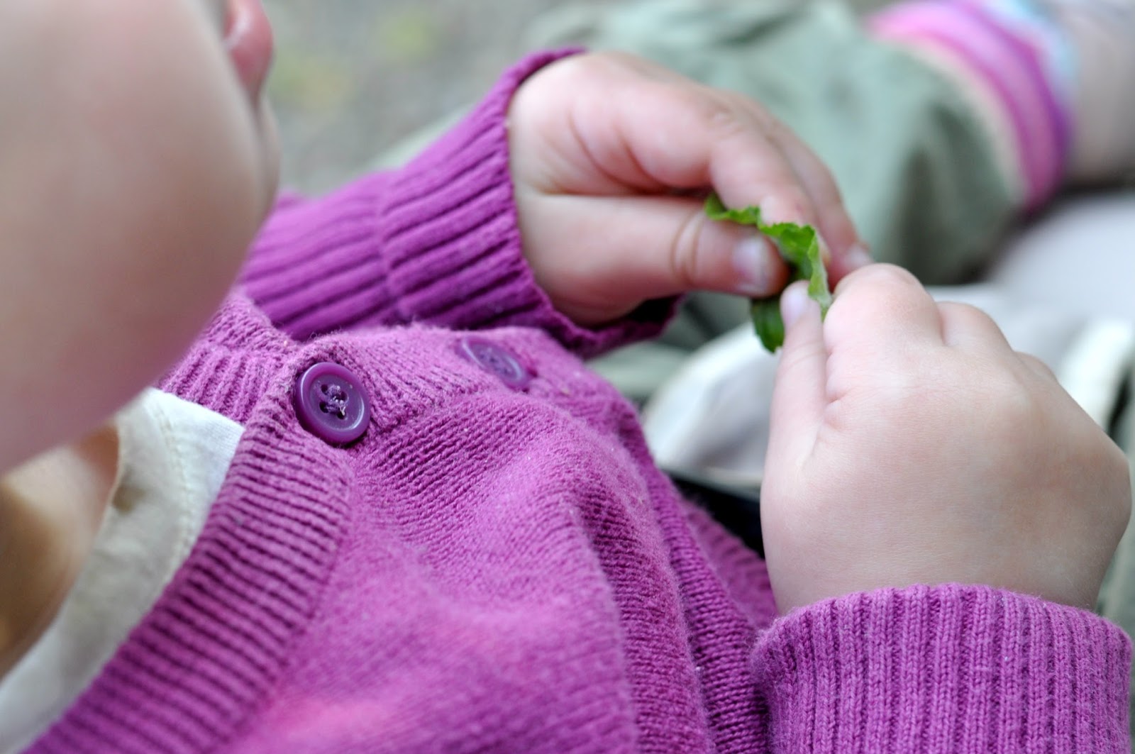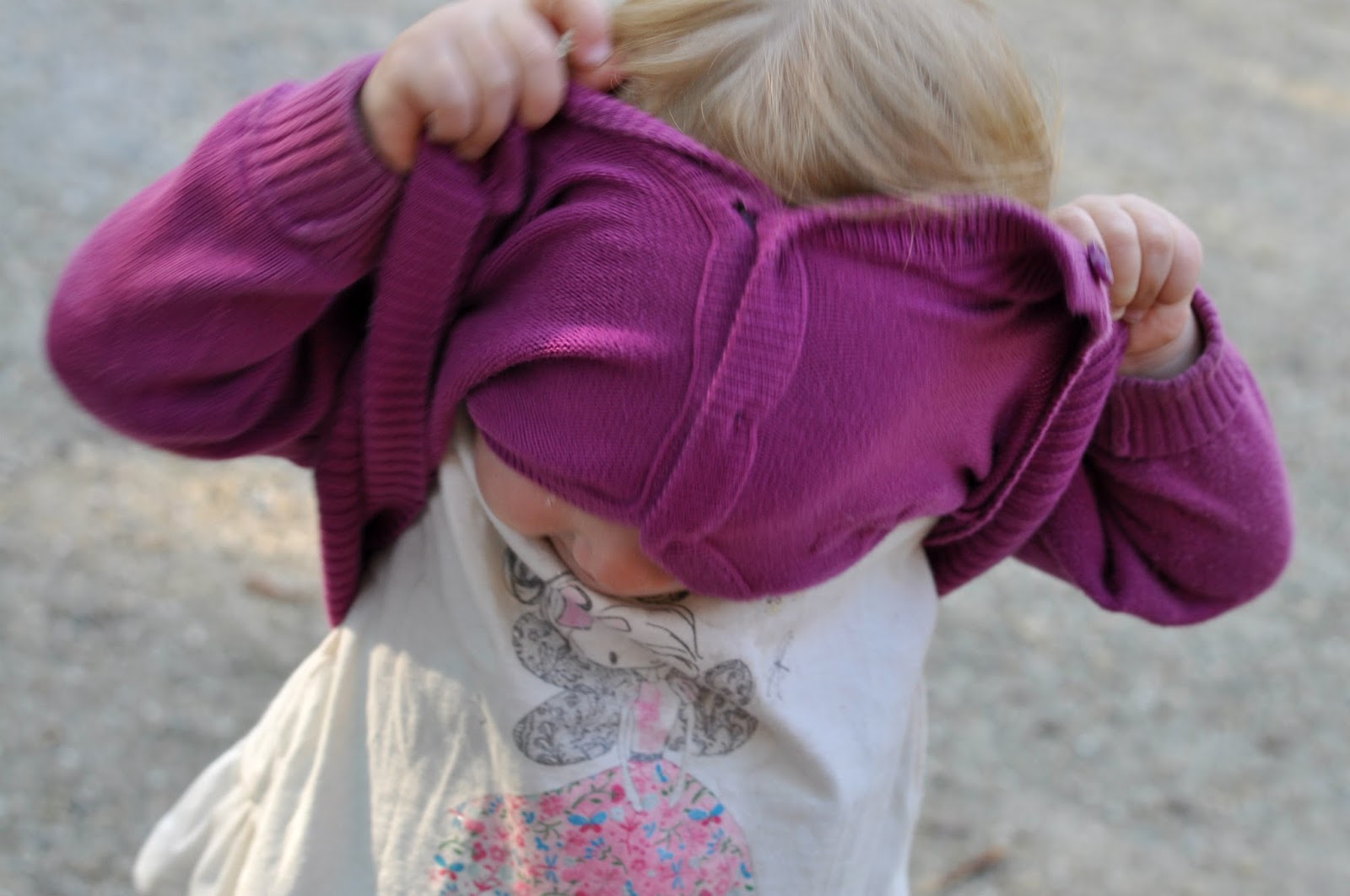 4. Schade, dass ich nicht im Kindergarten bleiben darf. Aber auf dem Spielplatz ist es ja auch ganz schön. Puh, aber warm ist es. Da muss die Strickjacke doch irgendwie über den Dickkopf gehen…